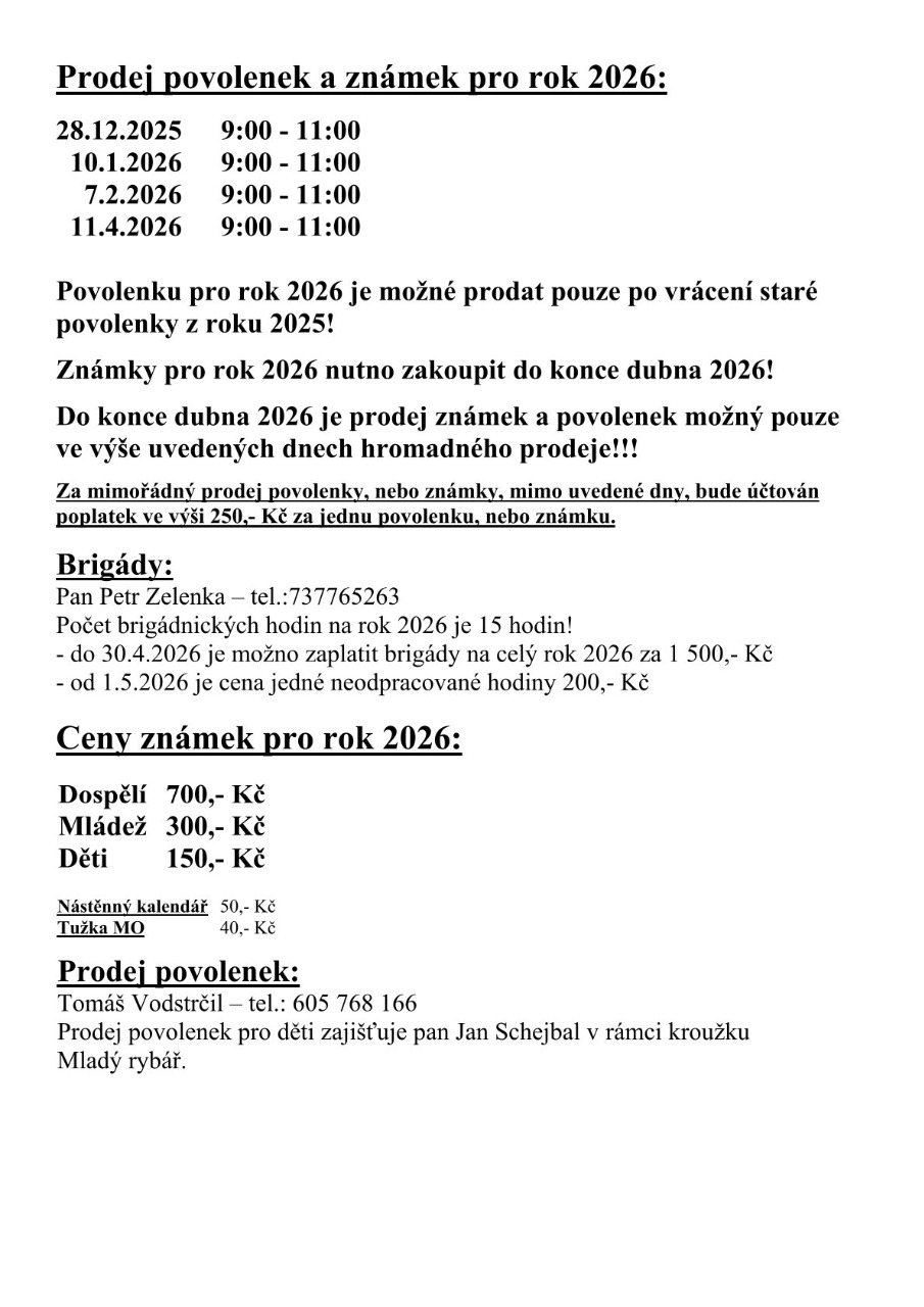 PRODEJ POVOLENEK MIMO STANOVENÉ TERMÍNY PO DOHODĚ
